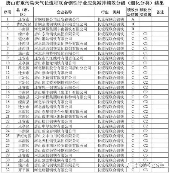 10月9日,唐山市人民政府印发了《10月份全市大气污染防治强化管控方案》。该方案显示,本次管控时限为2019年10月10日0时至10月31日24时。对钢铁行业(含高炉铸造),绩效评价为A、B类的不限产(注:A类企业仅1家,B类企业为2家,其余皆为C类),绩效评价为C类的烧结、球团装备、石灰窑、高炉停产50%(含)以上,以生产装备计,具体停产装备要求参照新修订的《重污染天气应急工业源污染物减排清单》“钢铁企业第一阶段减排措施”执行。