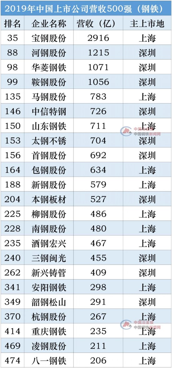 5月4日,根据2019年的营业收入排名,东方财富网发布了中国上市公司500强榜单。数据显示,中国上市公司500强(营收)2019年营收合计达到52.1万亿元,占上市公司总营收比例近80%。在钢铁行业中,共有23家上市公司进入2019年中国上市公司营收500强榜单。中国冶金报、中国钢铁新闻网将具体名单整理如下: