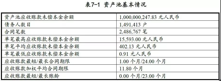 模拟资产池应收账款未偿本金余额为100,000.02万元,笔数为2,486,767笔,用户数量为1,491,413户,单笔借款最大未偿本金余额为15,593.00元,最小未偿本金余额为0.91元,平均为402.13元。