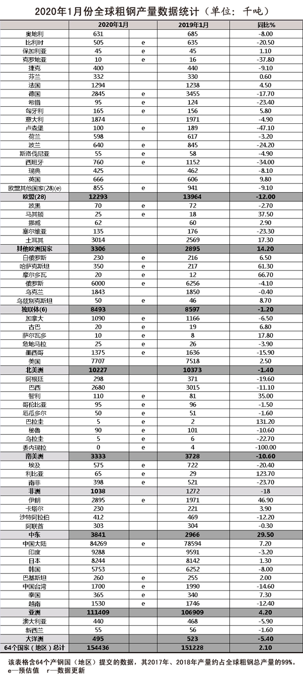 2月25日,世界钢铁协会(WSA)发布了1月份全球粗钢产量数据。1月份,全球64个纳入世界钢协统计的国家和地区粗钢产量为1.544亿吨,同比增长2.1%。