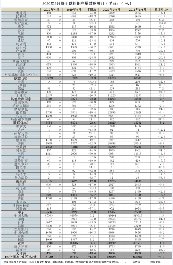4月份,亚洲粗钢产量为1.04亿吨,同比下降7.5%;欧盟粗钢产量为1073万吨,同比下降22.9%;北美洲粗钢产量为720万吨,同比下降28.3%;南美洲粗钢产量为210.5万吨,同比下降42.8%;中东地区粗钢产量为257万吨,同比下降22.0%;独联体的粗钢产量为655万吨,同比下降22.6%。