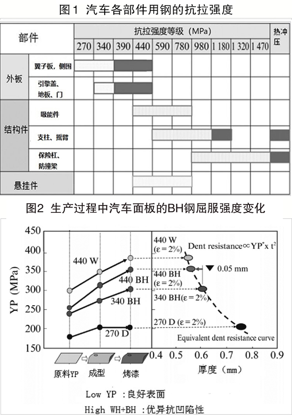 图2显示了用于汽车面板的BH(烘烤硬化)钢在生产过程中屈服强度的变化。这些钢板因冲压成型而表现出加工硬化,同时由于涂料烘烤的热量而时效硬化。在压制成型中,可通过降低屈服强度获得优异的表面质量。与常规340BH和普通440W钢板相比,440BH的屈服强度低于440W,与340BH大致相同;经烘烤处理后的440BH屈服强度高于340BH,接近440W??悸堑娇拱枷菪杂牒穸鹊?span style="FONT-FAMILY: Calibri; FONT-SIZE: 16px">1/2次方成正比,使用440BH钢代替340BH钢,可使厚度减小0.05毫米。440BH钢的低屈服强度归因于铁素体基体中的马氏体含量少。