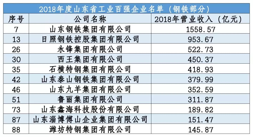 此外,在公布的2018年度山东省工业百强企业名单中,共有十一家钢企上榜。