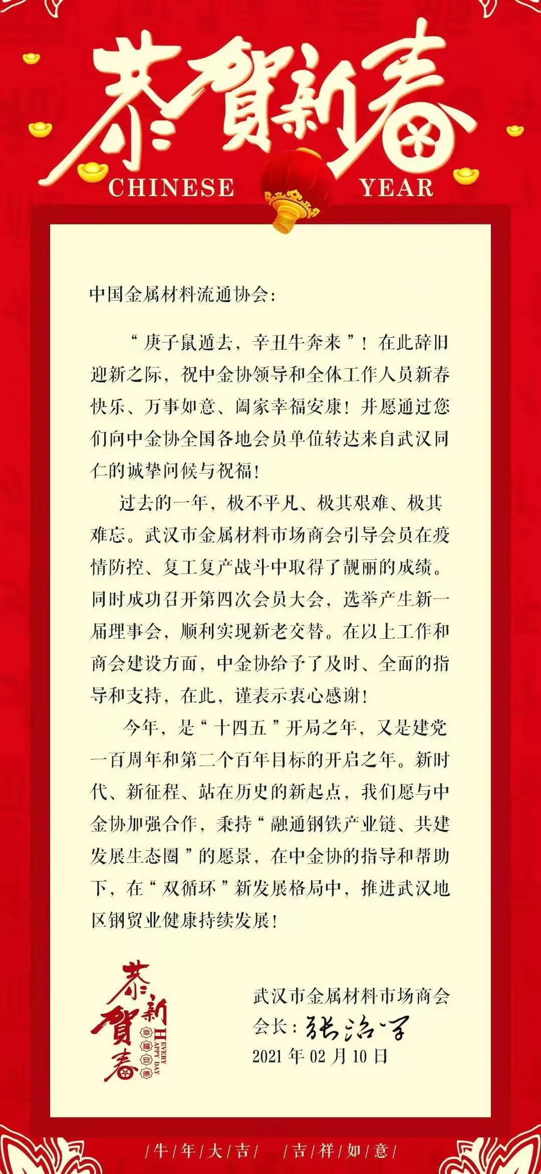 2月10日,武汉市金属材料市场商会会长张治学先生向中国金属材料流通协会发来新春贺信,感谢中金协的领导和全体工作人员,并向中金协全国各地的会员单位致以诚挚的问候和祝福!